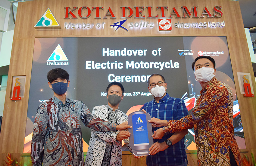 Kota Deltamas uses 10 units of Honda PCX Electric motorcycles. The electric vehicle procurement is made possible in collaboration with PT HPP Energy Indonesia (HEIN/a consortium of Honda and Panasonic) in a rental scheme through PT Takari Kokoh Sejahtera (Mitsubishi HC Capital Group). The electric motorcycle handover ceremony was held by Hisashi Murakami (President Director of PT HEIN) and Yasuke Goto (Vice President Director of PT HEIN) to Hongky J. Nantung (President Director of PT Puradelta Lestari Tbk) and Shinji Yoneda (Vice President Director of PT Puradelta Lestari Tbk) at the Marketing Office Kota Deltamas Cikarang on Tuesday (23/8).